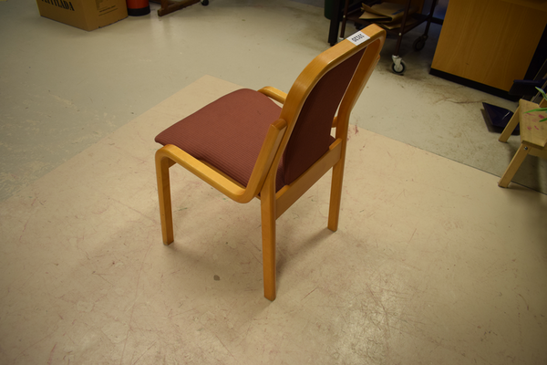 Trästol med sittkudde och ryggstöd i lila tyg. Sitthöjd: 44. H:83 B:52 D:47