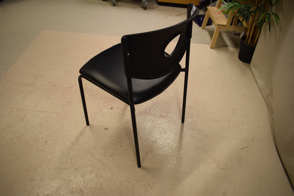 Svart stol med metallben, sittdyna i läder och ryggstöd i plast. H:81 B:45 D:50