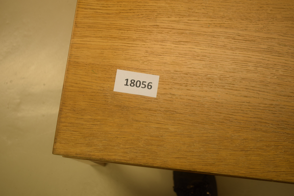 Bord med en trälåda. Finns repor och märken. D: 95, B: 95, H: 42.
