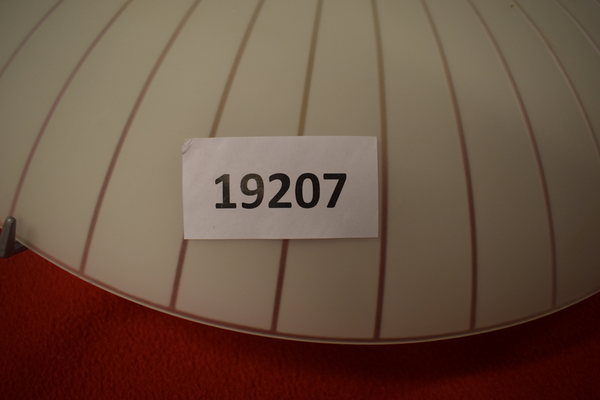 Taklampa med väggkontakt. I glas, frostad med ofrostade ränder. Ø: 52, H: 10.