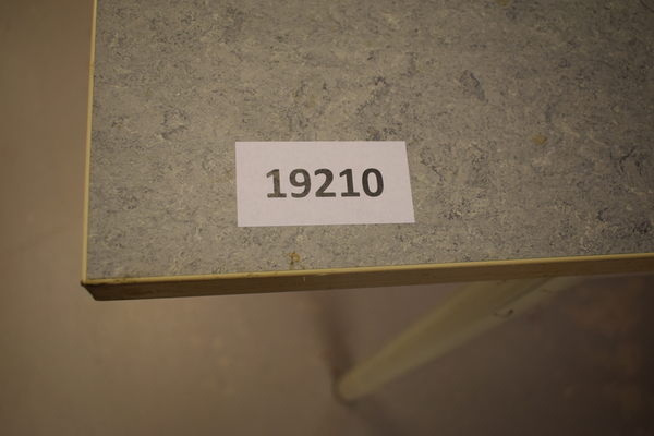 Bord med grå bordsskiva, och vita metallben. Manuellt höj och sänkbara ben. Finns repor och märken främst på benen. D:70, B:180, H74.