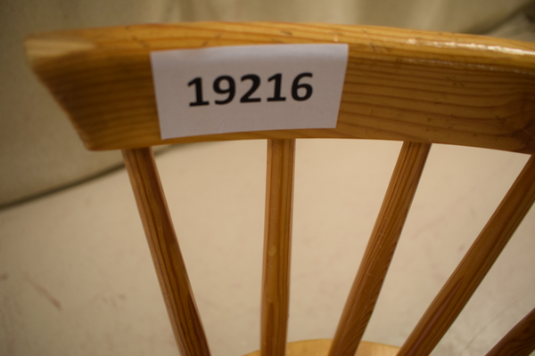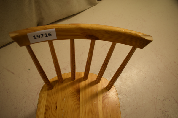 Barnstol i trä, äldre variant med ribbad rygg. Slitet i hörnorna på ryggstödet. D:34, B:37, H:61, H(sitt): 33.