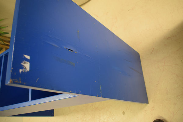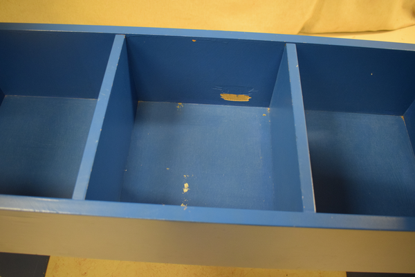 Blå bok-tråg i trä med 3 fack i varje. Finns märken och repor . D x 35 B x 90 H x 90