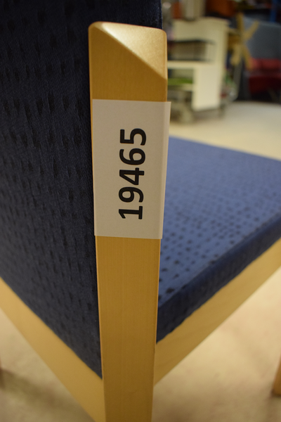 Trästol med vadderad tygsits och rygg. Finns repor och märken, är i använt skick. D:44, B:48, H(sitt):45.