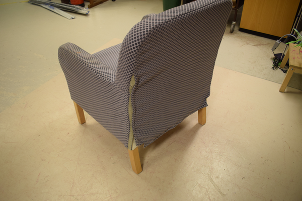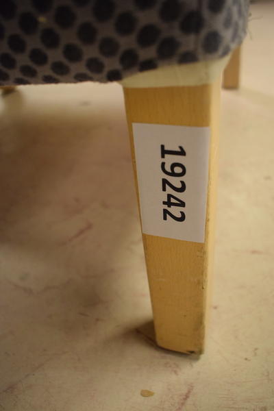 Blå prickig fåtölj med träben , rak rygg . Finns lite repor på ben . Mått: D x 70 B x 72 H x 91