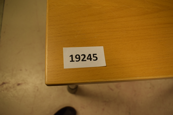 Bord med träskiva och ställbara metall ben . Finns repor / märken . Mått: D x 60 B x 100 H x 73 .