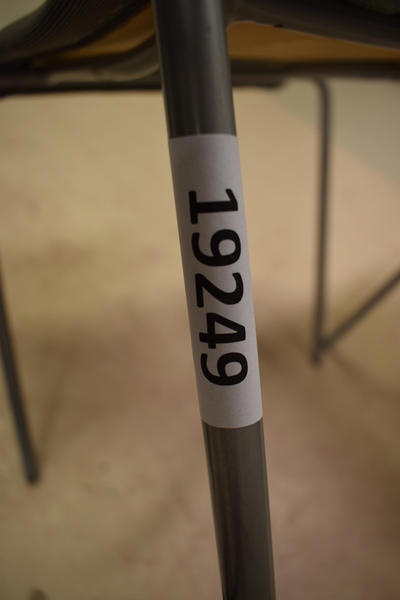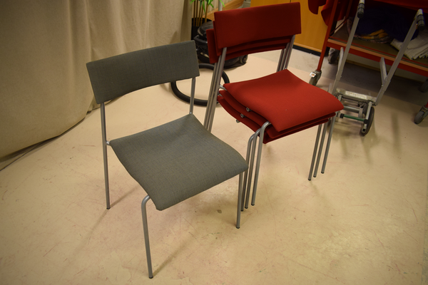 Fyra stycken stolar utan armstöd 3 röd , 1 grå . D x 45 B x 46 H x sits 46, rygg 76