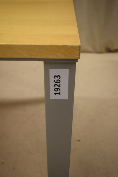 Två Träbord med träskiva och metall ben . Finns repor samt märken . Mått: D x 90 B x 180 H x 74.