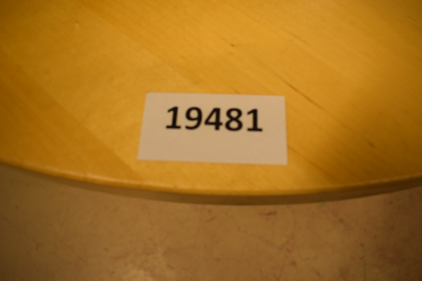 Träbord med en oval sida, och en rak sida. Är i använt skick, finns repor och märken. D:100, B:140, H:77.