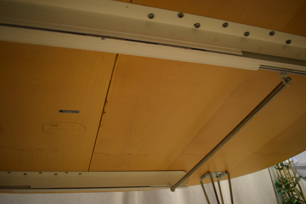 Stort ovalt träbord med metall ben , ljus färg på bordet. går att dela och lägga i mellan skiva , men finns ej med. Mått: D x 126 B x 180 H x 75