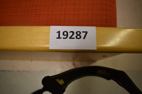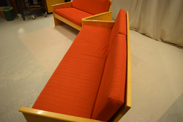 Träsoffa 2 delad med 2+3 del . Tyg sits och rygg i orange/röd färg samt ljus trä färg. (liten och stor soffa serie) äldre model av soffa . finns repor / märken . 2 sits mått : D x 70 B x 121 H x 69 3 sits mått : D x 70 B x 176 H x 69