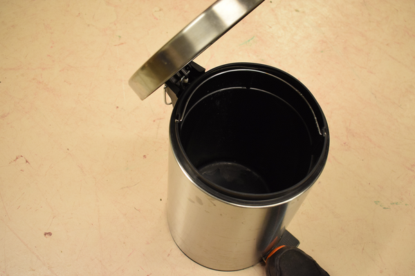 Papperskorg, som man öppnar med en tramppedal. Är i metall. Ø:28, H:40.