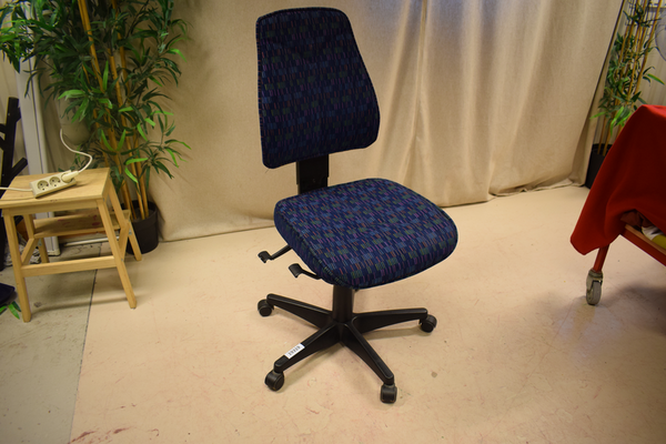 Flerfärgad kontorsstol med hög rygg. Höj- och sänkbar, samt sits förflyttbar. D:56, B:50 H(sits):46/59.