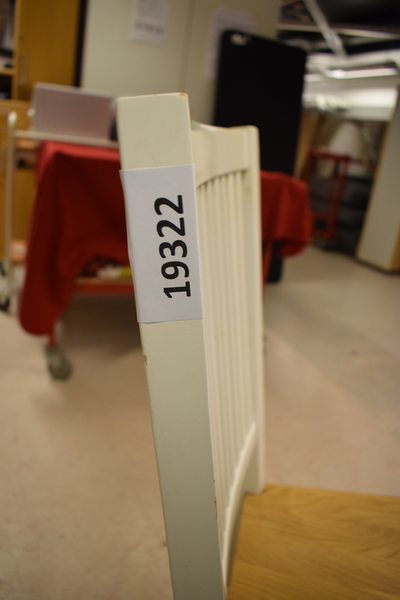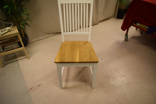 Vit trästol med ribbad rygg och träfärgad sits. Finns repor och märken. D:46, B:46; H(rygg):95, H(sits);45.