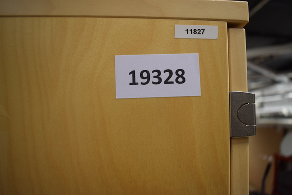 Träskåp med 1 hyllplan samt spegel på insida dörr, finns nyckel. D:60, B:40, H:164.