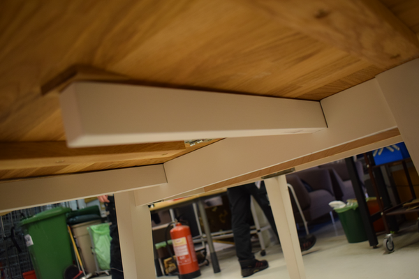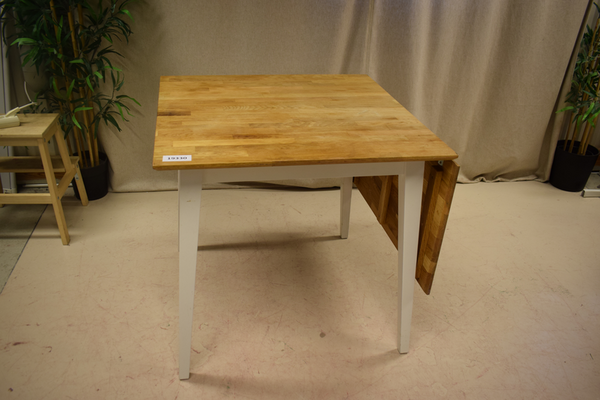 Bord med förlängningsplatta i trä. Finns repor och märken. D:80, B:80/124, H:74.