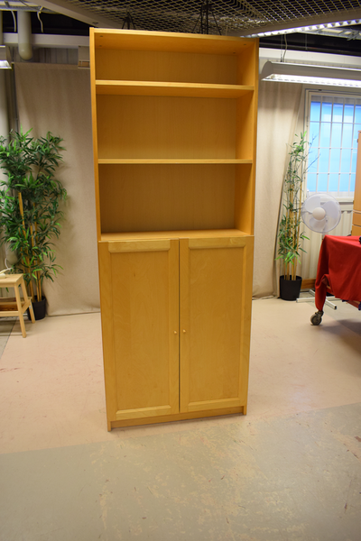 Skåp med dörr med 3 hyllplan innanför dörren, och 2 hyllplan över. Finns repor och märken. D:30, B:80, H:202.