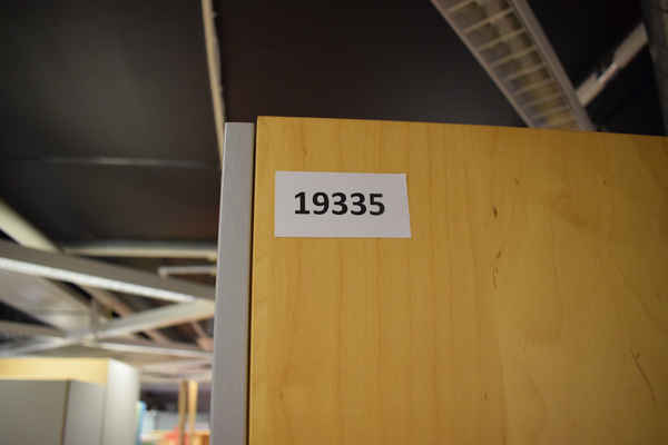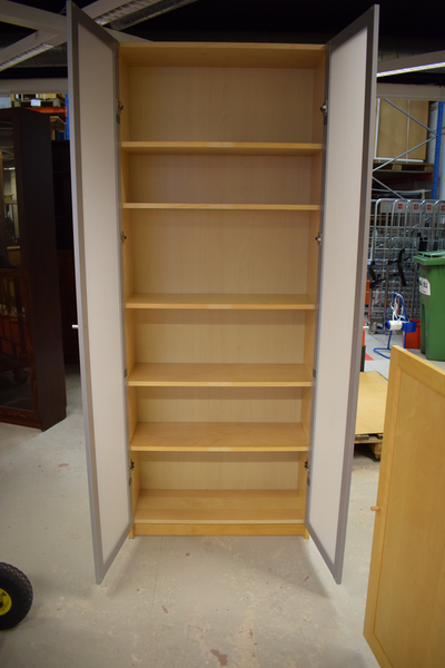 Skåp i ljust trä färg med 6 hyllplan . Dörrar med frostat plast .