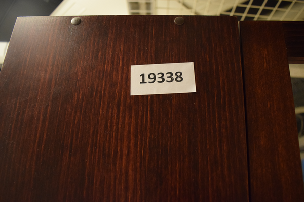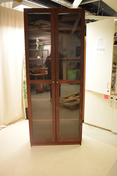 Trä hylla med glasdörrar . körsbärs färgad röd / brun . 6 stycken hyllplan . "Billy hylla" Mått: D x 30 B x 80 H x 201