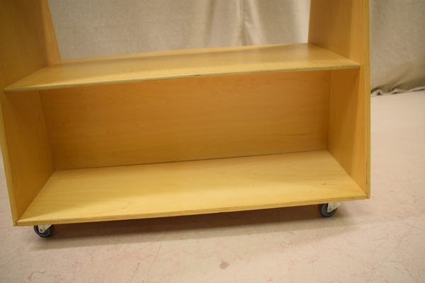 Bokhylla av trä med hjul. 3 hyllplan, nedersta hylplanet delad i en fram- och baksida. 2 bokstöd. H:94 B:87 D:61
