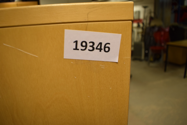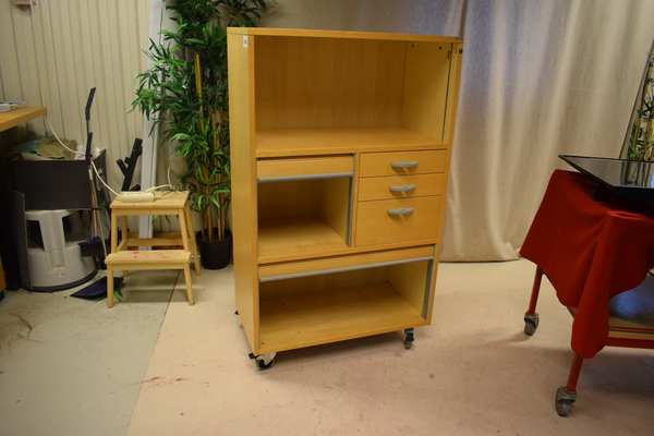 Kontorsbyrå. Har 1 ovanhylla, 3 lådor 1 jalusifack på sidan och 1 jalusifack nedtill. Har hjul som är låsbara. Finns repor. D:42, B:81, H:134.