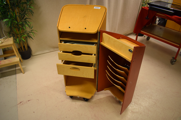 Pulpet på hjul, röd och träfärgad, har pappershållare samt 3 lådor i olika storlekar och 2 hyllpan. Går öppna och stänga, saknar nyckel. Är i använt skick. D:66, B:50, H:106.