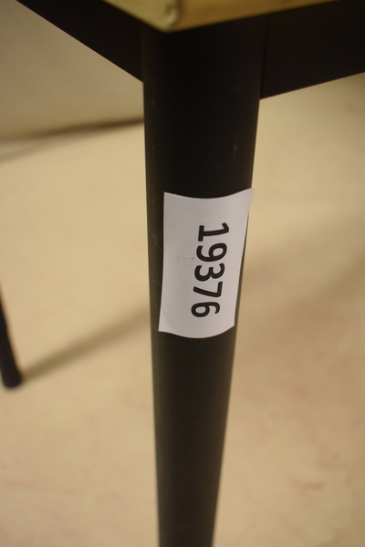 Träbord med svarta metallben. Är i använt skick, finns repor och märken. D:60, B:120, H:76.