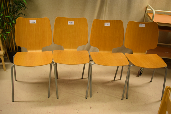 Stol i trä med metallben. Finns märken på vissa av stolarna. D:49, B:49, H:80, H(sitt)47.
