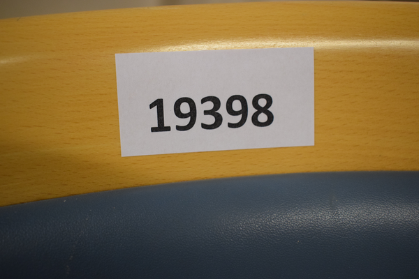 Stol i blått tyg och trä. D:50, H:61, H:95, H(sits):45.