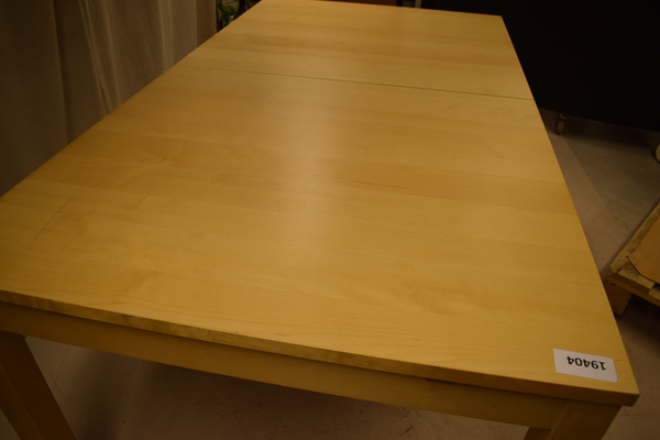 Stort bord med träben, går att lägga i mellanskiva, men bräda saknas. Är i använt skick med märken och repor. D:95, B:176, H:75.