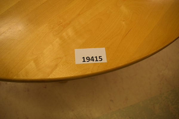 Runt träbord, benen står lite ostabilt. Finns repor och märken. Ø:130, H:75,5.