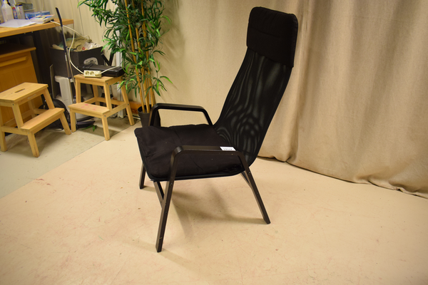 Svart fåtölj i nätad tyg och träben. Kommer med sittdyna och kudde för huvudet. Sitthöjd:41 H:113 B:63 D:68