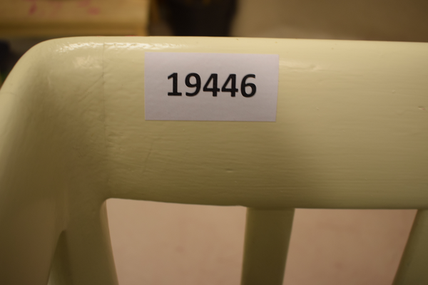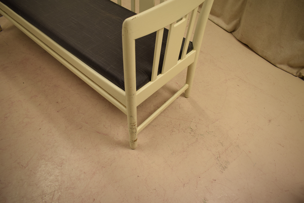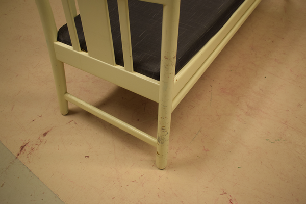 träsoffa med vadderad sits. Vit färgad trä, och mörkgrå mönstrig sits. D:55, H:158, H:76, H(sits):43.