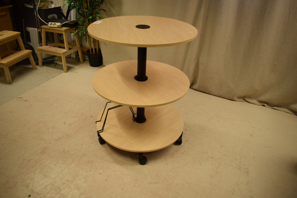 Rund trähylla på hjul med metallbas i mitten. Pärmställ på nedre hyllan. H:87 B:Ø68
