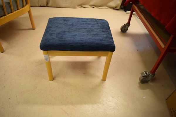 Trästol med mjuk sits. 3 av stolarna har rullhjälp. Det finns en passande fotpall. Sitthöjd:45 H:90 B:56 D:50
