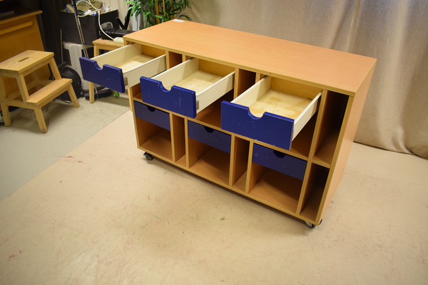 Träbyrå med 6 blå lådor, 6 hyllplan och 6 fack. H:80 B:120 D:45