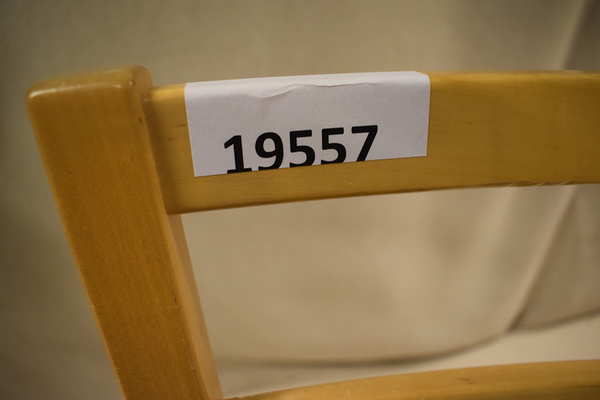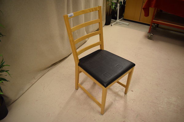 Trästol med svart konstskinn på sitsen. D:53, B:44, H:91.