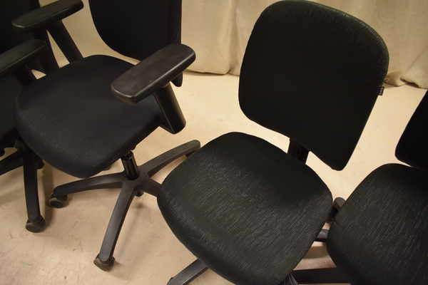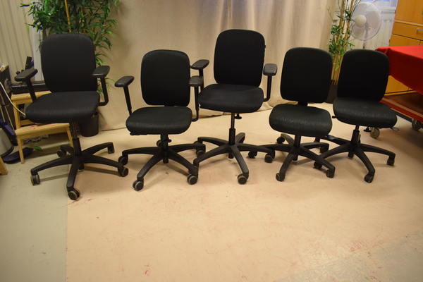 3 Kontorsstolar med armstöd och 2 utan. Är tillverkade av savo. Är i använt skick och en är lite sönder på ett av armstöden.