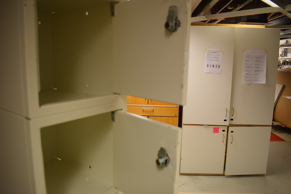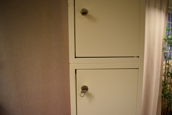 Vit plåtskåp med 3st låsbara fack. H:91 B:27 D:36