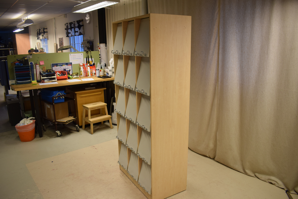 Broschyrställ med skåp för varje ställ bakom samt skåpet är i trä och metall .