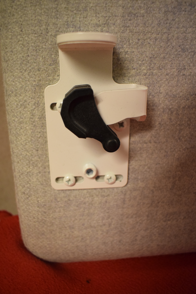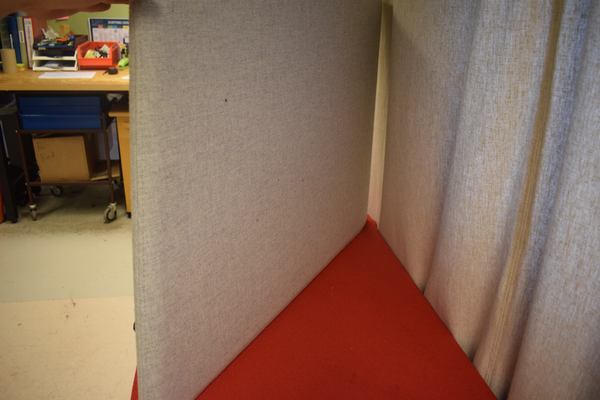 Bordskärmar i grått tyg. En av plastspännen saknas på ena bordsskärmen. H:65 B:87 D:8