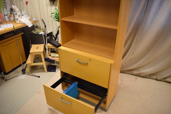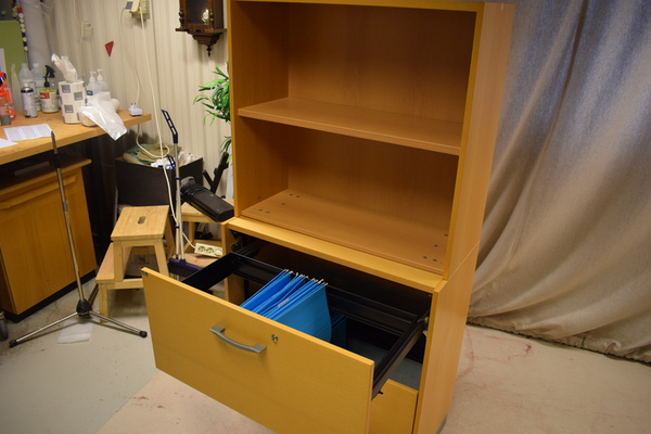 Träskåp med 2 hyllor ovan och 2 lådor för hängmappar nedanför. Nyckel saknas. H:158 B:80 D:44
