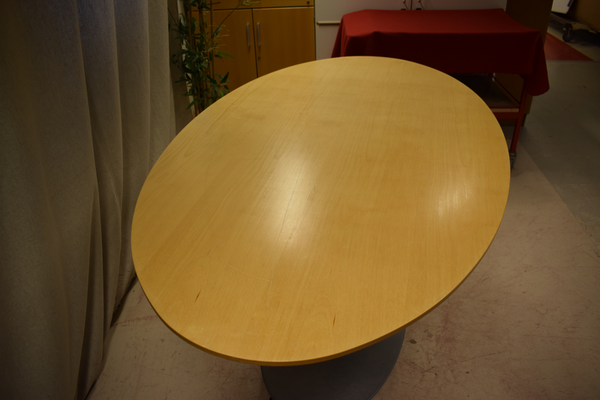 Bord med oval träskiva och stor metallfot. H:73 B:160 D:90