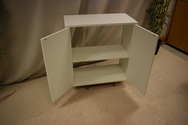 Vit träskåp med 2 hyllplan utan baksida. Dörrar med tryckstängning.