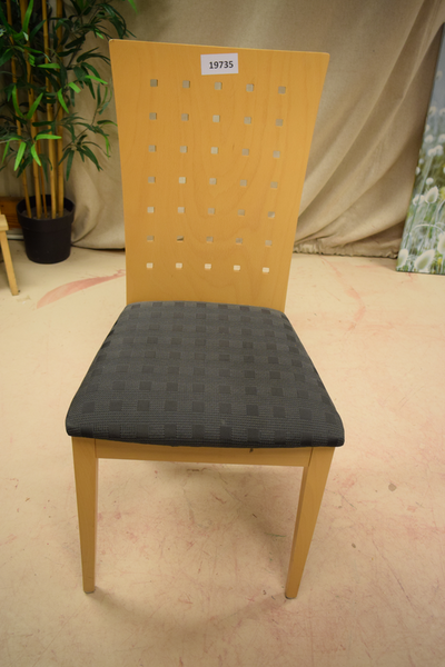 Trästol med tygsits i mörkgrått mönster. Sitthöjd:47 H:96 B:47 D:46