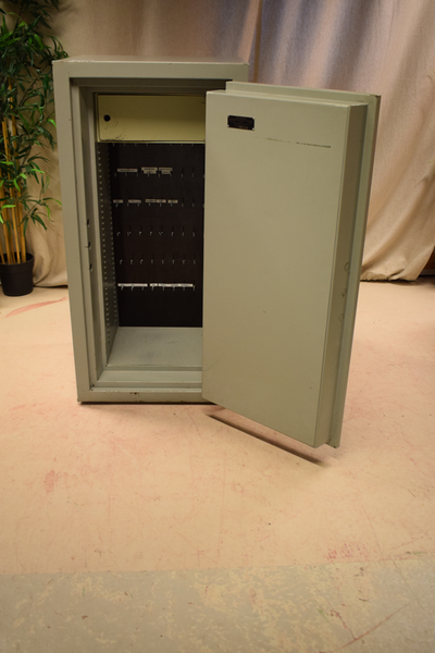 Ljusgrön brandsäker kassaskåp i metall och betong. H:120 B:61 D:56