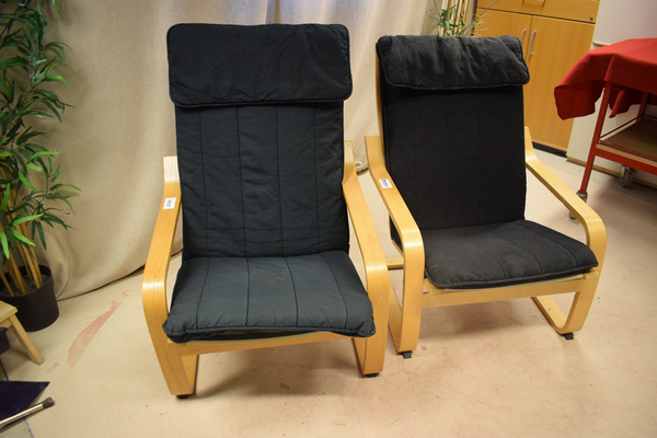 Fåtölj med tygsit/rygg och träram. En har svart tyg och den andre är mer mörkblå.