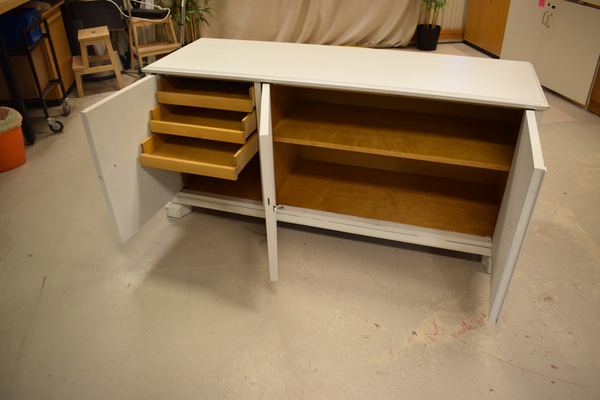 Byrå i massivt trä (tung) , vit byrå med stort skåp och ett litet skåp 2+1 dörr. Tre lådor i det mindre skåpet. Ej nyckel . D 52 x B 156 x H 76