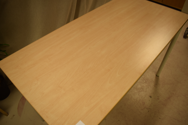 Bord med träskiva, och metallben. Finns repor och märken. D:60, B120, H:73.
