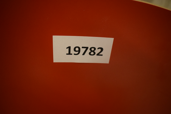 Röd stol i trä med metall ben . D x 54 B x 55 H x 46/86